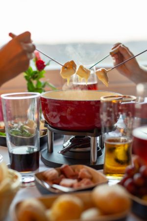 Rauensteiner Käsefondue - Auswahl an verschiedenen Brot- und Knödelwürfeln, Prager Schinkenwürfel, pikant eingelegtes Gemüse, süße Trauben, Kartoffeln "Drillinge"