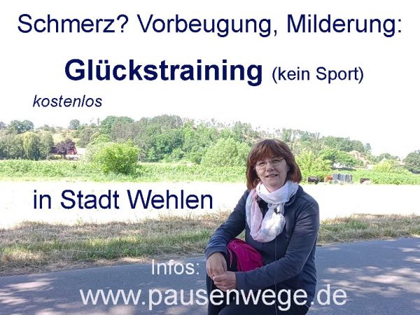 Schmerz vorbeugen und mildern für Körper und Geist und Seele (ganzheitlich) mit meinem Glückstraining (kein Sport). Sanftes aus Mentaltraining, aus Naturcoaching, aus Lachyoga. Für alle Menschen, ob jung oder im Herzen jung geblieben. Auch für Geh-Beeinträchtigte, chronisch Beeinträchtigte und Rollstuhlfahrer geeignet. Treff ist in Stadt Wehlen OT Pötzscha (Bahnhofseite, südliche Elbseite) am Fähranleger-Wartehäusschen. Es findet bei jedem Wetter statt, außer Starkregen und starker Hitze. Anmeldung gern per E-Mail, dann kann ich Bescheid geben, falls es zum Beispiel wetterbedingt oder aus anderen Gründen ausfällt oder vorbeikommen auf "GutGlück". Info unter www.pausenwege.de. Mein YouTube-Kanal: Pausenwege